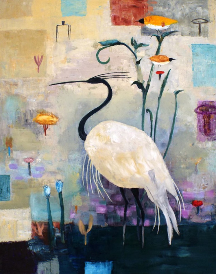 “Valentina DuBasky, an artist known for her evocative magical realist style featuring totemic animal images and lushly colored surfaces...There is something wonderfully provocative about the different degrees to which the birds are depicted as “being there…” This effect of fading in and out help to create a vivid sensation of movement, suggesting a cyclical condition wherein time and place vary, but the processes of birth and rebirth remain constant.”
